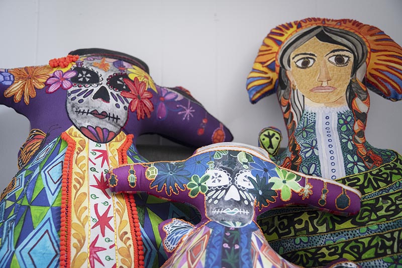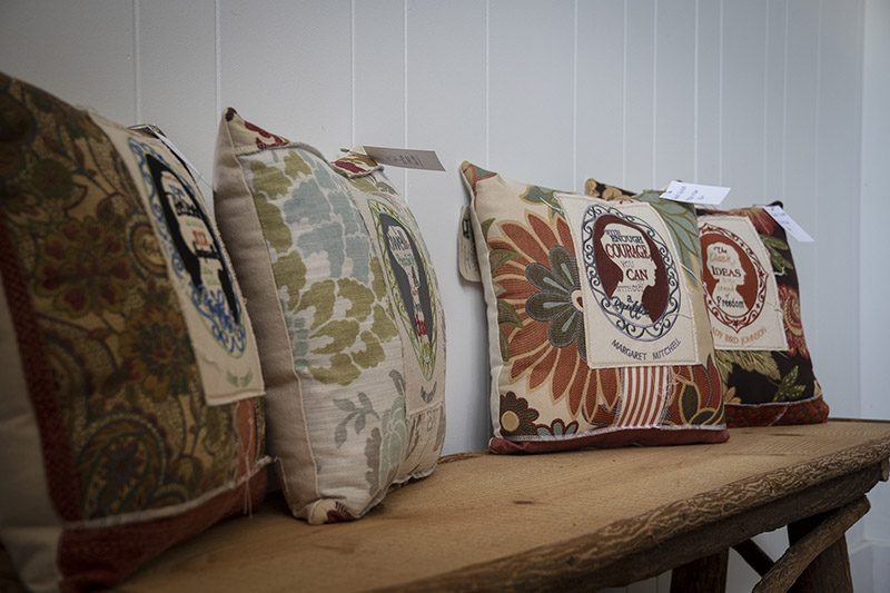 Originally from Colorado, textile artist Stacy Sheehan-Wilson now practices her art in Fairhope, Alabama. She tells stories through upcycling clothing, found objects, and photos into pillows and quilts and especially loves cotton.