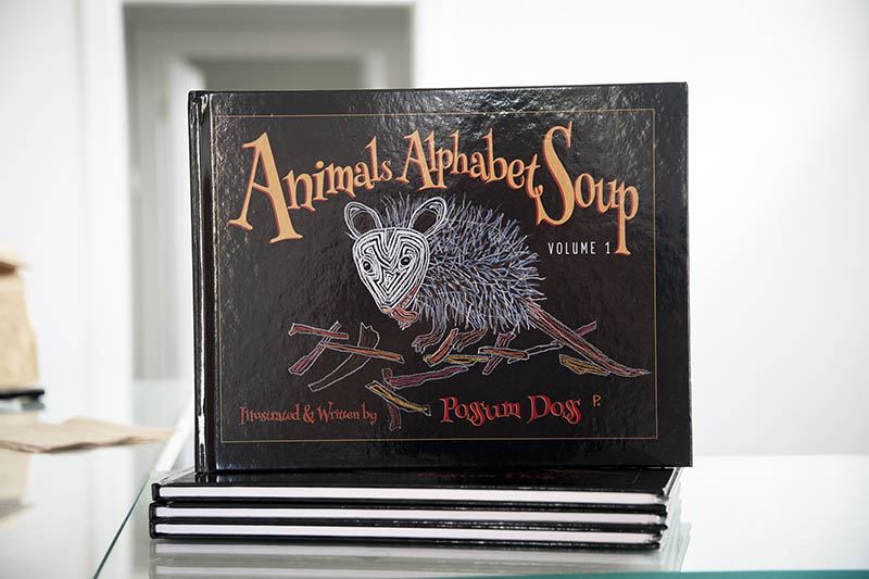 Birmingham artist Possum Doss works in a variety of mediums and loves to crochet. His whimsical hats and bags are wearable sculptures. You can find Possum’s children’s book, Animals Alphabet Soup, at the gallery