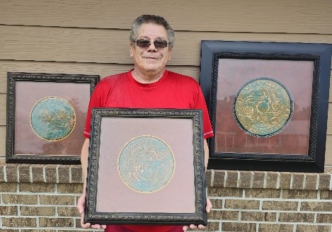 Melvin Manning, Jr. “I have been shell carving and copper tooling for eight years. I exclusively design my pieces with traditional imagery and designs. I have spoken with historians and researched the traditions behind this art medium. Throughout the years, I have been grateful to place in different art competitions and this year won best of show in the Poarch Band of Creek Indians Art Show.”