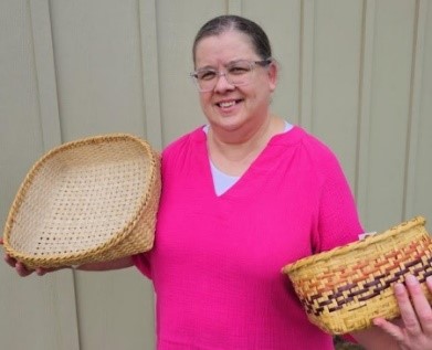 Margaret Baggett “I began weaving baskets in 2009. In 2011, I became the traditional arts demonstrator for the Poarch Band of Creek Indians. I work with commercial binder cane, a replica of rivercane, and use rivercane when it’s available to make creek baskets. To make honeysuckle baskets, I use commercial round reed, a replica of honeysuckle. I teach classes on variations of traditional baskets.”